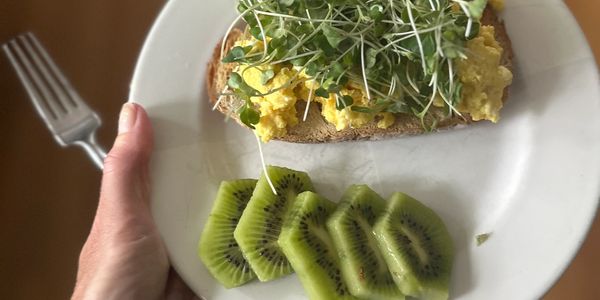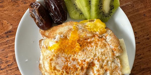 Fried egg in butter, extra virgin olive oil, or tallow. Toast sourdough and place egg on top. Sprinkle with Turmeric and black pepper. Slice one kiwi and add 2 dates.