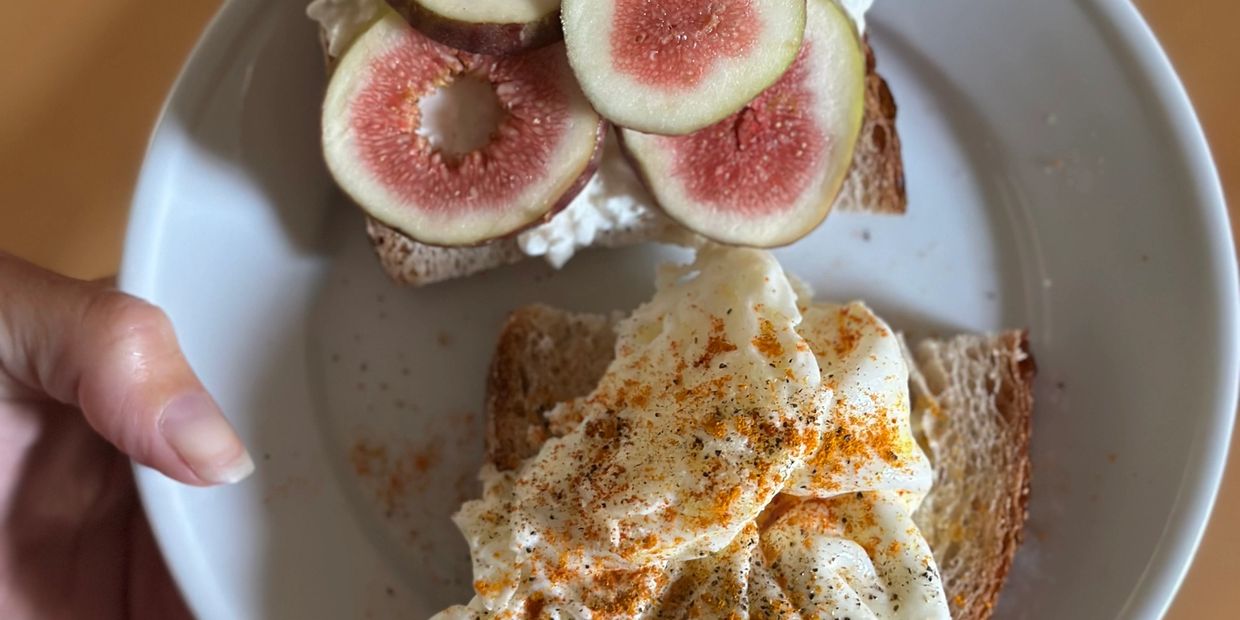 Fried egg (fried in butter, extra virgin olive oil EVOO or tallow) placed on half a piece of sourdough toast, Add Turmeric and black pepper. Sliced figs and cottage cheese on half piece of sourdough toast.