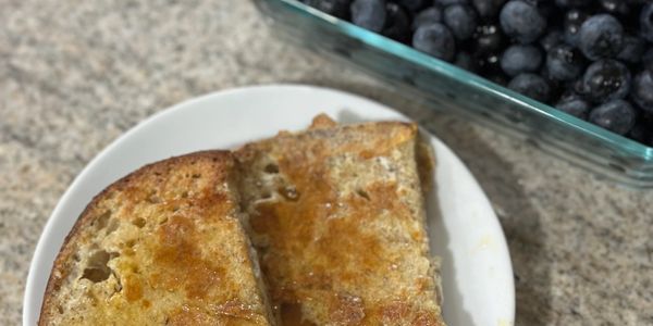 Scramble 1 egg in a bowl and add a sprinkle of cinnamon, soak the break in the egg mixture. Cook on Medium heat until brown on both sides. Plate the slices (I add butter on top) drizzle with honey to liking. Wash blueberries ( I like to soak in a bowl with water and baking soda to clean) add 1/2 cup to your plate and enjoy!