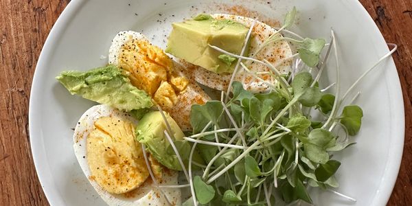Hard boiled egg with turmeric and black pepper sprinkled on top. Sliced avocado and pea sprouts as a side.