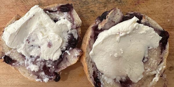 Homemade blueberry bagel, made with 3 ingredients : 1 cup greek yogurt, 1 1/2 cups flour, 1 tsp baking soda. Super easy and loaded with 11 grams of protein! Add protein powder for a bigger punch!