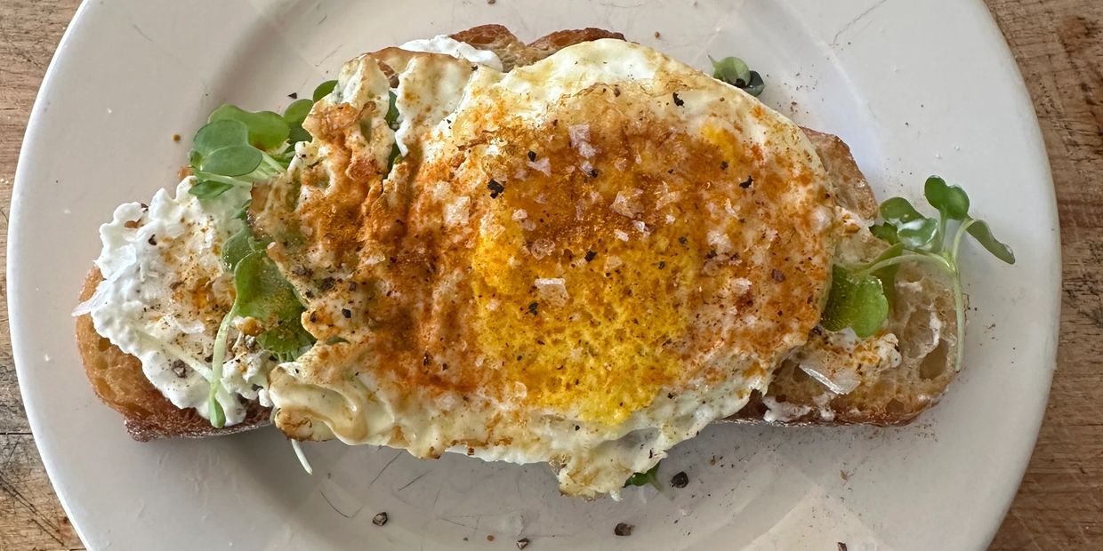 Fried egg in butter, extra virgin olive oil, or tallow, sprinkle with Turmeric and black pepper.. Toast sourdough, spread cottage cheese on top, followed by broccoli sprouts and place egg on top on top.