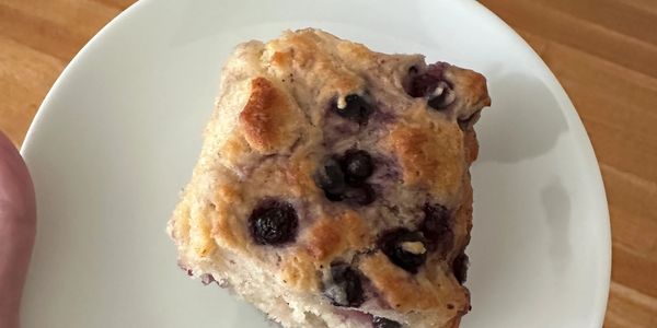 Homemade blueberry scones, made with 5 ingredients : greek yogurt, flour, baking powder, salt, egg. Super easy and loaded with 11 grams of protein! Add protein powder for a bigger punch!